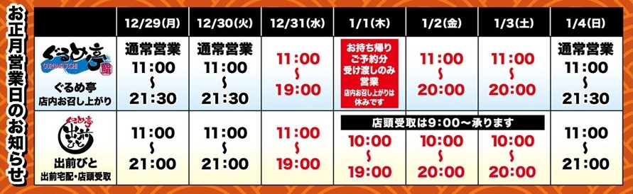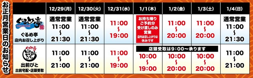 年末・年始 営業時間変更のお知らせ demaebito 1週間前 日頃よりぐるめ亭をご愛顧頂きありがとうございます。 年末・年始の営業時間のご案内になります。通常の営業時間と異なりますのでご注意下さい。 ■鶴見岸谷店 ■西谷店 ■藤沢長後店 年末年始対応メニューご予約となります。 ご予約は2025年12月20日までの受付になります。